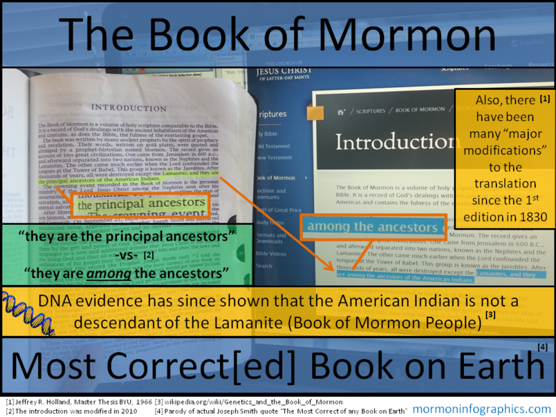 This change may not seem like much, but there is a big difference between "principal" and "among." The reason for this change is because DNA testing has been done on more than 150 Indian tribes from North, Central and South America to test the claims of the Book of Mormon. Of the tens of thousands of tests performed, 99.4% have DNA that shows American Indians are descended from east Asia. This is further supported by huge amounts of archaeological, anthropological, and linguistic evidence the ancestors of these American Indians migrated from east Asia via the Bering Sea Straits over 10,000 years ago.